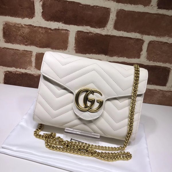 La mini bolsa de la cadena GG Marmont tiene una forma suavemente estructurada y un cierre de colgajo con hardware doble G. El hardware está inspirado en un diseño de archivo de los años 70. Hecho en matelassé Chevron Leather.